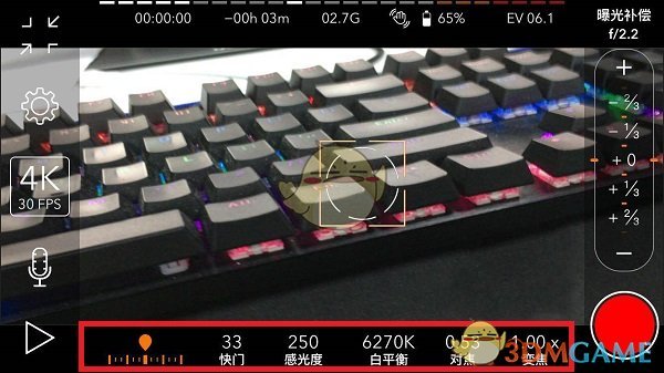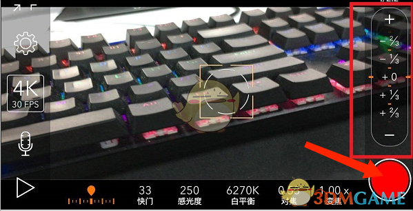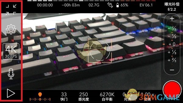 打开promovie选择右上方的【相机】选项进入拍摄界面,这里有缩放屏幕、设置、4k30fps等选项可按需使用,下方能更改快门、感光、白平衡等参数,右边显示具体数据,在底部选设置后滑动右边栏可修改参数,设定好拍摄对象和效果后,点击右下角【红色圈圈】图标即可拍照。