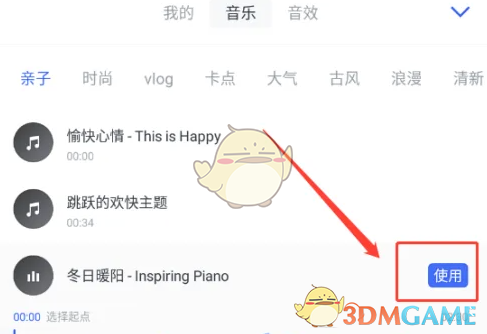 4、在音频列表中点击"使用"按钮即可添加背景音乐。