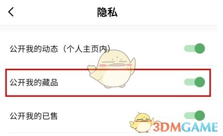 3、在隐私页面中打开按钮,选择关闭公开我的藏品按钮就可以了。