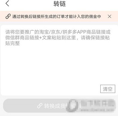 2、返回个人中心界面,找到"转链"功能入口。将刚才复制的订单信息粘贴到转链工具中,系统会自动将其转换为可分享的链接。