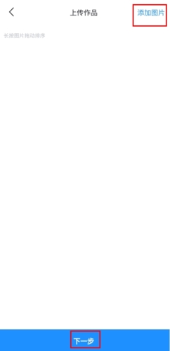 2、在上传作品页面中点击添加图片按钮,图片上传之后点击下一步按钮;