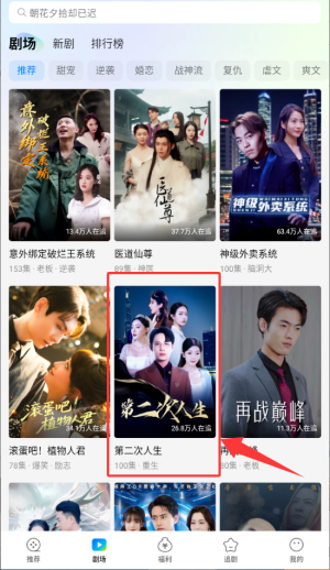 在剧场页面,您可以浏览热门推荐或通过分类筛选找到感兴趣的短剧。比如选择《第二次人生》,就能立即开始观看这部精彩作品。