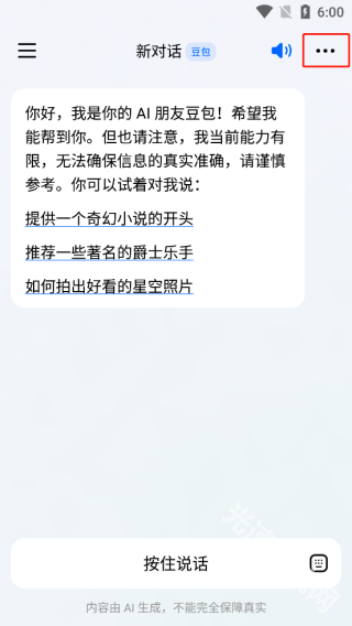 2、进入主界面后,长按底部【按住说话】按钮,即可开始语音对话,也可直接输入文字进行交流;