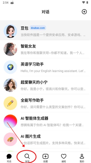 1、进入豆包APP,点击底部导航栏中的【发现】按钮;