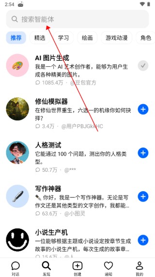 2、在发现页面顶部的搜索栏中,输入目标AI智能体关键词;