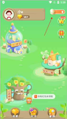 用户如果想要在大卫熊英语中想要获取动物,就需要用到精灵蛋来兑换,用户可以在进入应用页面后点击如下图红包箭头所指的精灵蛋。