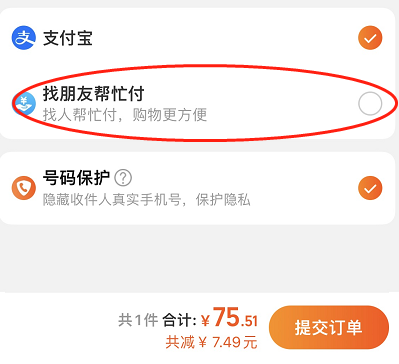 选择心仪商品后点击购买按钮进入订单页面,在支付方式中选择"找朋友代付"功能。