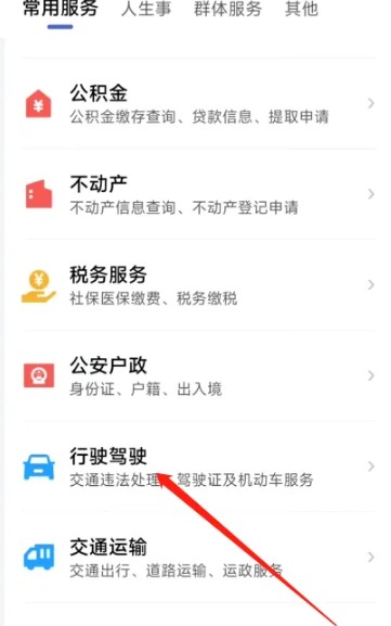 第二步:在分类导航栏中找到【行驶驾驶】选项,点击进入交通管理服务专区。