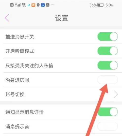 进入设置,然后把【隐身进房间】的按钮开启即可。