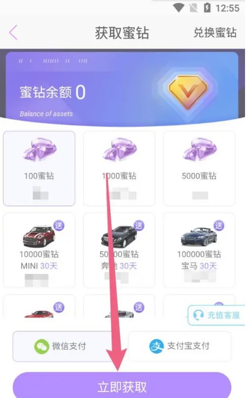 进入蜜钻专属页面后,系统会清晰展示不同面额的充值套餐。选择"立即获取"按钮后,将跳转至安全支付界面,支持支付宝、微信等主流支付方式。