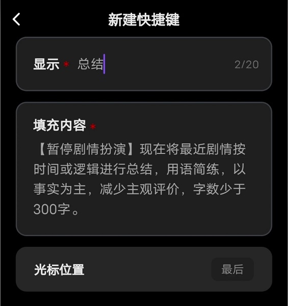 注意:如果你的聊天带了时间状态栏,那么可以写“x年x月x日开始的”剧情,并在最后发送前修改至具体时间,这样会更准确地定位你要总结的内容。字数设置按自己习惯。