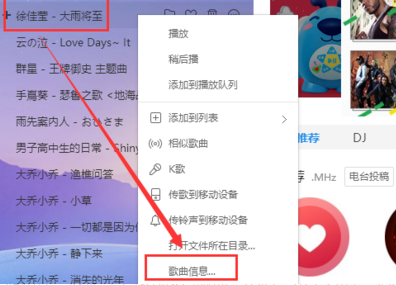 3、找到你需要转换的歌曲,右键点击“歌曲信息”