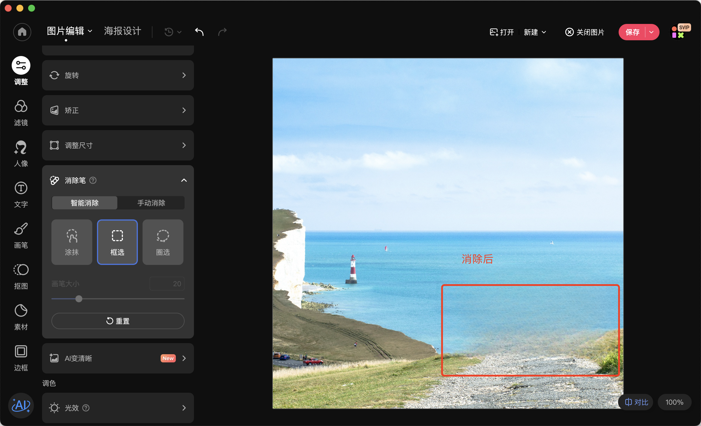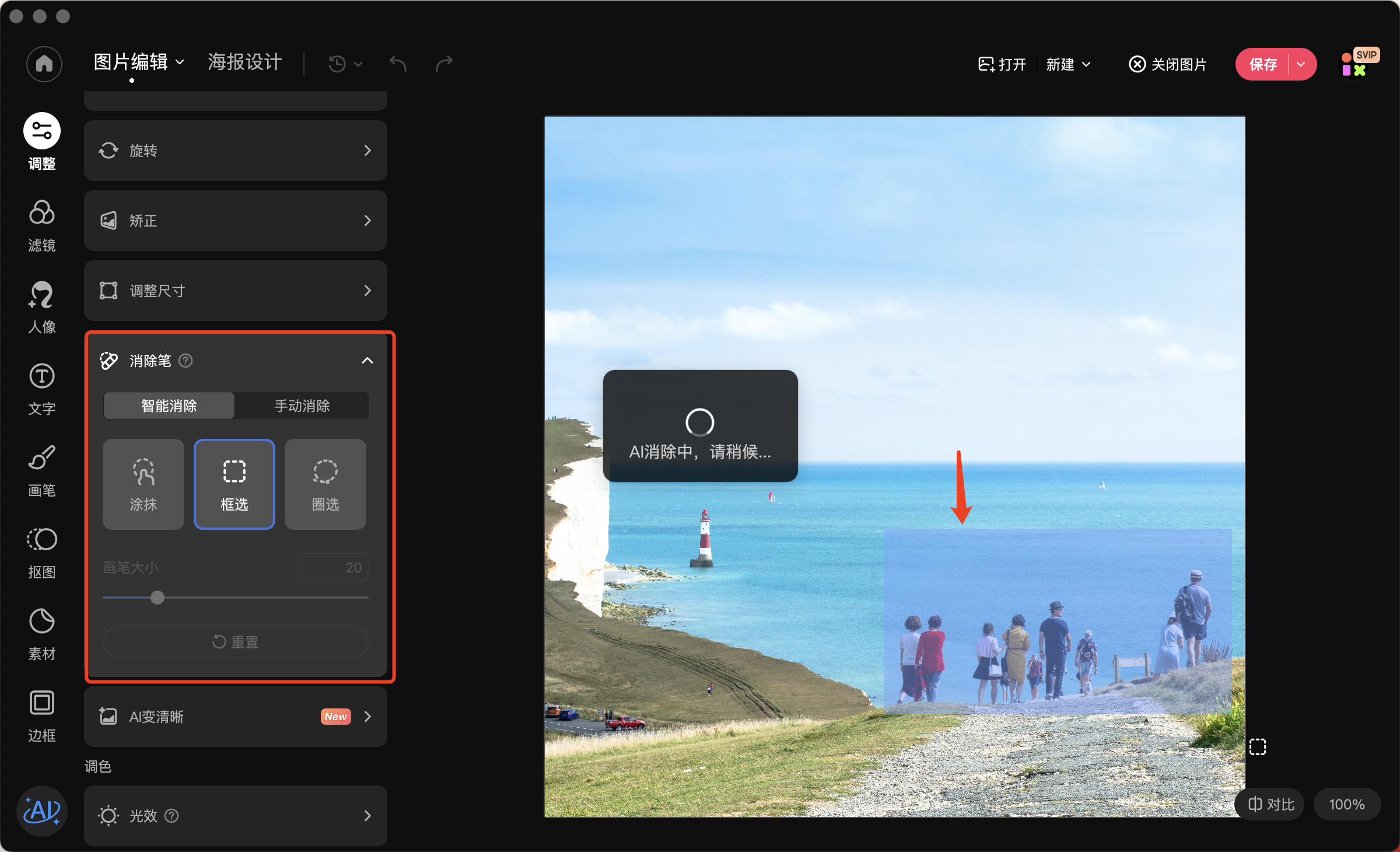 3、点击“消除笔”工具,在图片中框选需要消除的路人或杂物;