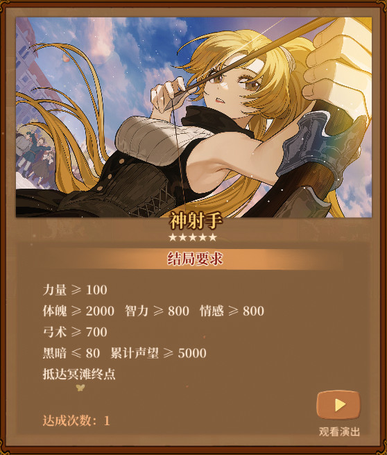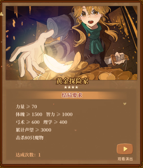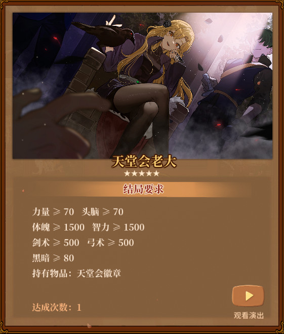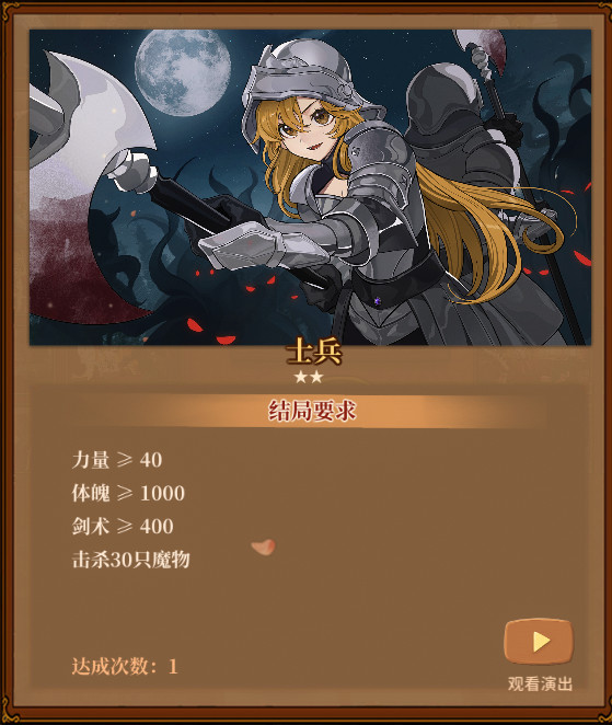 选择的领主,相应骑士任务满级,且击杀100魔物,三个领主都可达成