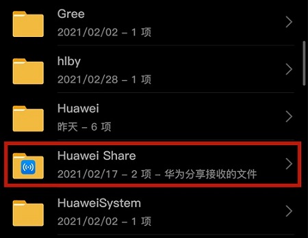 3、此时可以看到文件夹“huawei share”,点击进入。
