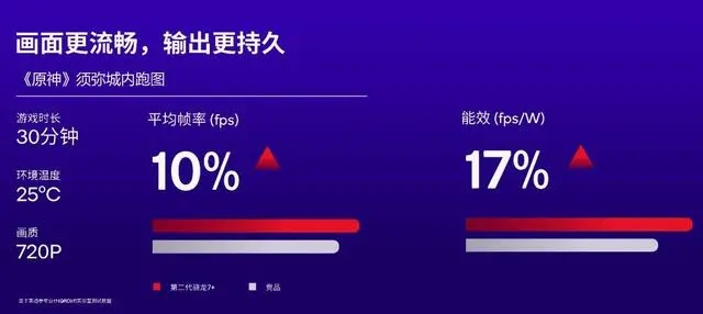 连续游玩半小时,常温环境下,720p游戏画质,平均帧率高出了同价位竞品机型10帧,能效也高处17%。