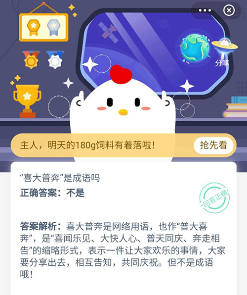 以上就是关于喜大普奔是成语吗?这个问题的正确答案,以后小伙伴们就知道喜大普奔不是成语,今天又增长一个小知识呢。支付宝蚂蚁庄园中的小鸡答题每天都在更新,想更好的获得小鸡饲料,就赶紧来关注沙包手游吧。