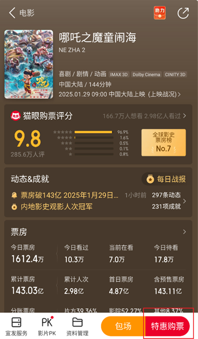 2、进入电影详情界面后,点击右下角“特惠购票”。