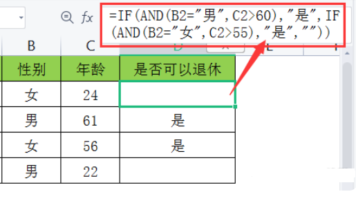 D2=IF(AND(B2="男",C2>60),"是",IF(AND(B2="女",C2>55),"是",""))来进行判定。