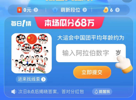 以上就是淘宝大赢家每日一猜7.26日的答案分享了,答案是23。成都第31届世界大学生夏季运动会中国大学生体育代表团成立大会召开。本次中国代表团由来自100所高校的411名运动员组成,平均年龄22.9岁,也就是23岁答案的由来了。