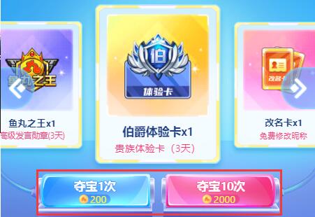 2、鱼丸夺宝有机会获得改名卡、发言勋章、贵族体验卡等奖励。