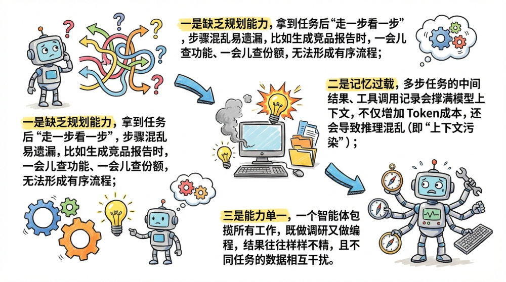 一是缺乏规划能力,拿到任务后“走一步看一步”,步骤混乱易遗漏,比如生成竞品报告时,一会儿查功能、一会儿查份额,无法形成有序流程;二是记忆过载,多步任务的中间结果、工具调用记录会撑满模型上下文,不仅增加Token成本,还会导致推理混乱(即“上下文污染”);三是能力单一,一个智能体包揽所有工作,既做调研又做编程,结果往往样样不精,且不同任务的数据相互干扰。