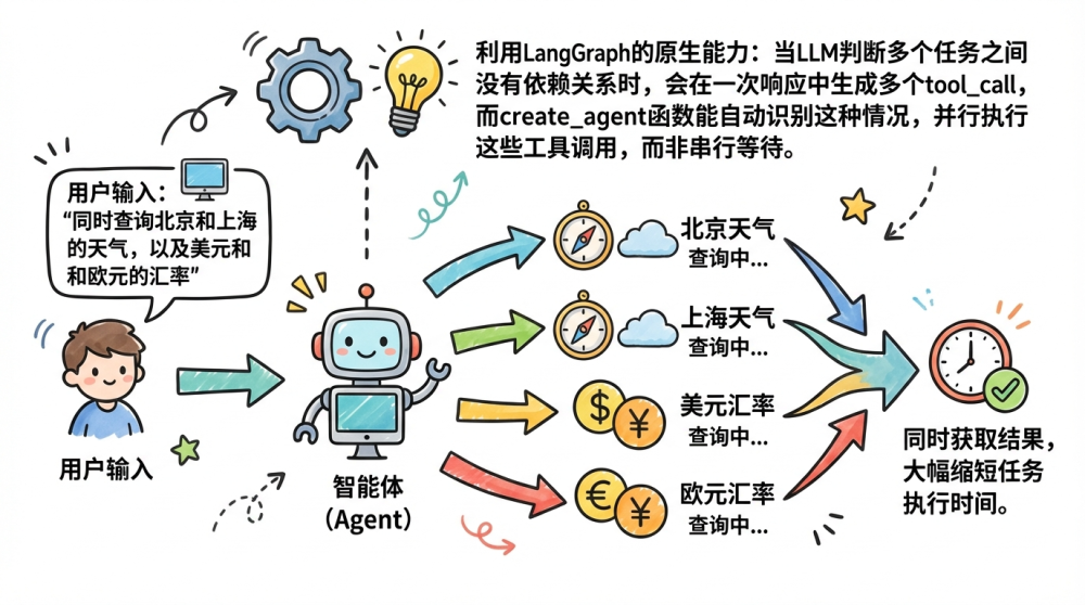 当智能体拥有“记忆”后,我们可以进一步优化效率——实现并行工具调用,让智能体能够同时处理多个独立任务,解决普通智能体“串行执行效率低”的问题。