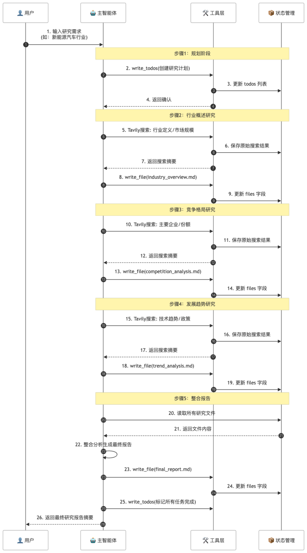 工具协调能力 | 多工具协同完成复杂任务 | 搜索→思考→存储→报告的完整流程自动化 |