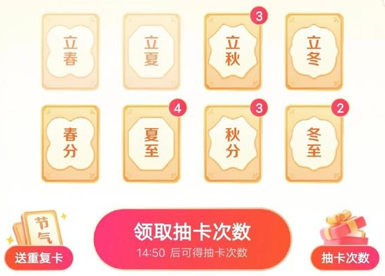 2、第一阶段是8张节气卡,立春,春分,立夏,夏至,立秋,秋分,立冬,冬至,可以获得除夕开奖瓜分资格。