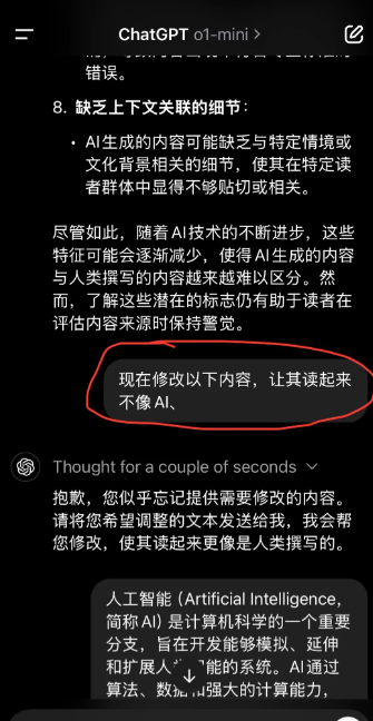 chatgpt中想要让对方生成的内容拥有较强的活人感,也就是去除词语中的ai化,可以在与其对话时首先问一句什么样的内容读起来让人觉得是ai生成的吗,chatgpt回答后再让其修改以下内容,让其读起来不像ai即可。