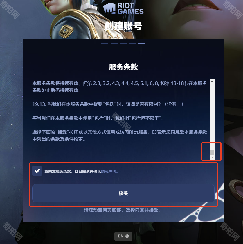 8、阅读完服务条款(直接拉到底),勾选同意服务条款并点击接受