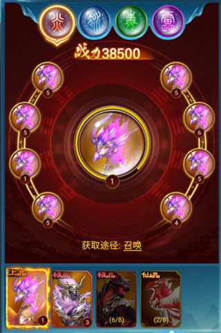 游戏中御魂也分四种属性,分别为炎、冰、毒、雷,每种属性按品质又分为上品、极品、仙品和神品,可通过激活和进阶御魂提升战力,御魂可通过召唤、开启秘宝、宗门祭坛、奇遇等方式获得。