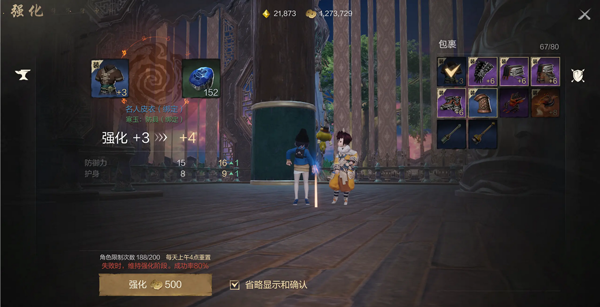 剑灵2中的强化系统不包含继承功能,更换装备就需要重新强化,并且分解强化过的装备也不会返还强化石。而目前装备的稀有顺序为普通(绿色)<上级(蓝色)<稀有(紫色)<至尊(橙色),这就意味着至尊以下的装备为过渡装备,如果将强化石都用在过渡装备上,无疑是非常浪费的。为最大化强化石的使用效率,推荐玩家仅将过渡装备强化至+3,因为前期装备的迭代速度较快,适当强化过渡装备不仅可以获得较多的强化属性,还不会损失太多强化石。