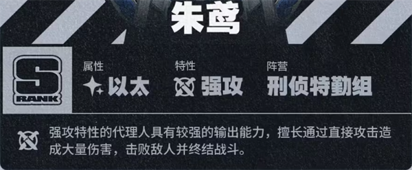 若队伍中存在【支援】特性代理人或其他隶属【刑侦特勤组】的代理人,朱鸢发动强化特殊技、连携技或终结技时,将在一定时间内提升自身暴击率。
