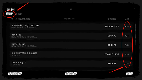 2.在【房间】界面后中,我们可以看到其他玩家所创建的房间,任意点击一个房间即可与其他游戏玩家共同畅玩。