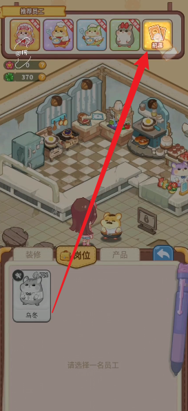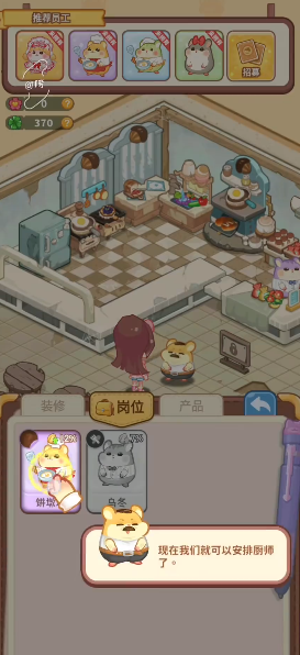 3、第一个店铺是餐厅,点击右下角的岗位来安排仓鼠进行工作。