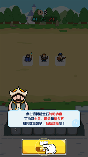 冲关小队是一款玩法轻松休闲的冒险闯关游戏,玩家们进入游戏之后将会需要召集各种士兵来进行闯关的作战,由此展开属于自己的冒险之旅,主要的玩法就是通过消耗精金石来进行抽奖,根据抽奖之后的结果来获取到相应的收益,为自己的队伍增加相应的实力,抽奖的栏位一共存在六个,其中会随机出现精金石、角色以及增益的选项,当通过的选项出现了三个以上的时候,就能够获取到对应的奖励,出现的个数越多所能够获取到的奖励也会越丰富,由此你将能够就此体验到十分爽快的游玩体验。