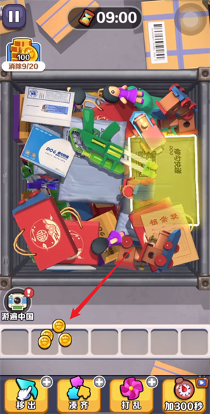 2、通过点击,将框子里面的物品凑齐三个,就能够将其进行消除。