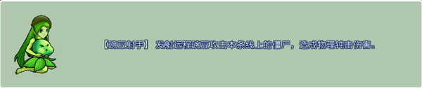 一、【豌豆射手】 发射远程豌豆攻击本条线上的僵尸,造成物理钝击伤害。