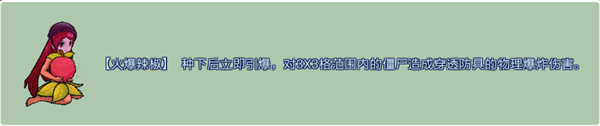 四、【火爆辣椒】 种下后立即引爆,对3X3格范围内的僵尸造成穿透防具的物理爆炸伤害。