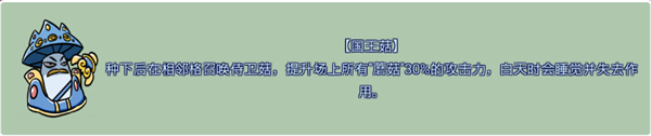 七、【国王菇】种下后在相邻格召唤侍卫菇,提升场上所有“蘑菇”30%的攻击力,自天时会睡觉并失去作用。
