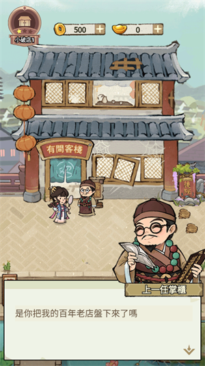 1、在55手游下载安装进入到游戏内后,从上一任掌柜中盘下了百年老店。