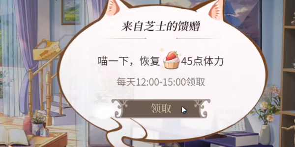 1.需要记得每日指定时间内【中午1200~1500、晚上1730~2100,每日两次】,点击窗台边的猫咪,领取芝士的馈赠,获取体力值。