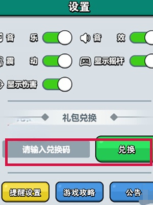 2.随后在【设置】界面找到【礼包兑换】。在图中所示的中输入正确的【礼包码】,点击【兑换】即可获取奖励。