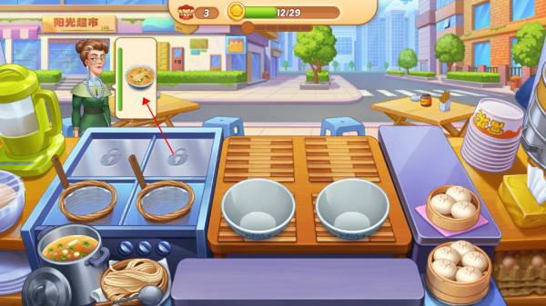 3. 留意烹饪的火候,当食物烹饪好之后,点击将它们从锅中捞出,然后点击相应的食物以送给等待的顾客。