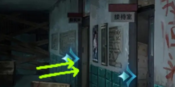 5.前往左侧进入走廊,看到走廊上有恐怖娃娃,在右侧找到接待室,使用门禁卡将接待室的门打开。