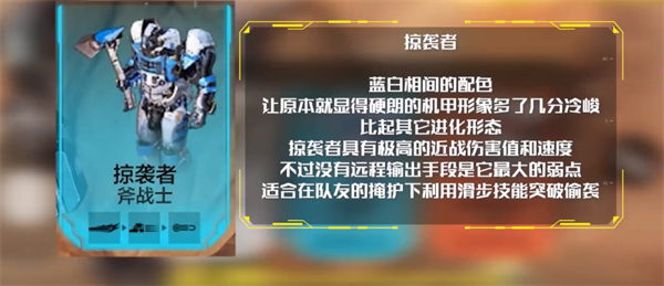承担突破、切入的任务,升级后配备了一把蓝色的战斗斧,拥有滑步技能,移动速度快,近战伤害高,最高等级时,消灭敌方机甲,可以刷新滑步技能。