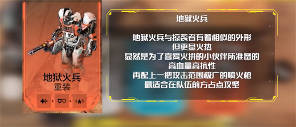 在团队中承担肉盾角色,负责占点攻坚。其升级后的特点是血量高,抗性高。可以使用喷火枪,升级后拥有紧急维修功能。最高等级时,喷火枪的范围扩大,可以造成大量范围伤害。