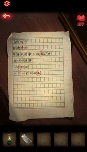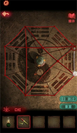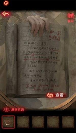 10、纸条上圈出来的字就是地下暗门的答案,打开之后进去,镜子旁的本子上得知,将线涂红阵法就消失了。