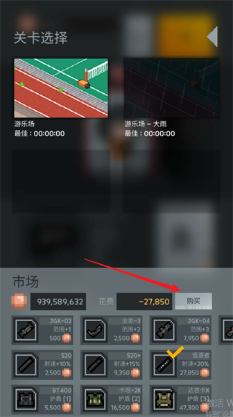 接着玩家们进入到关卡选择,在下方可以选择购买武器装备。